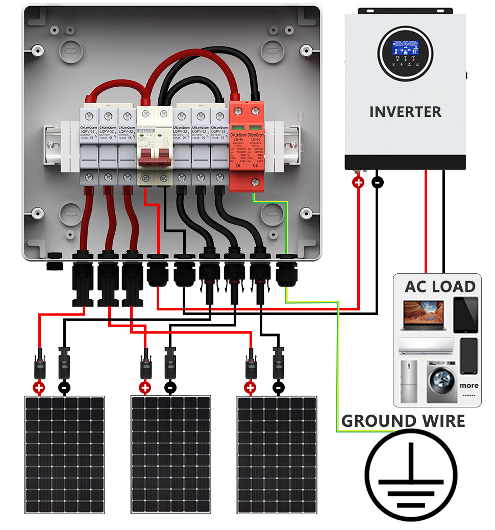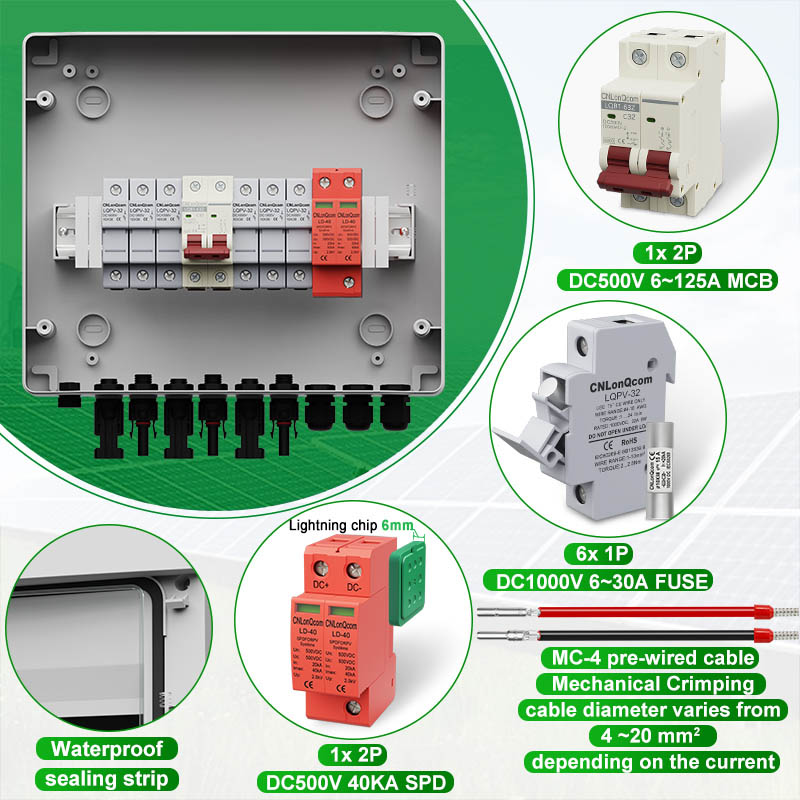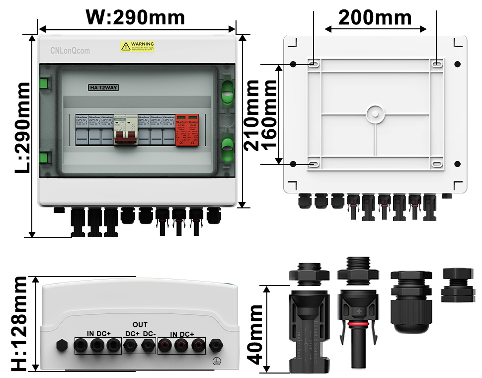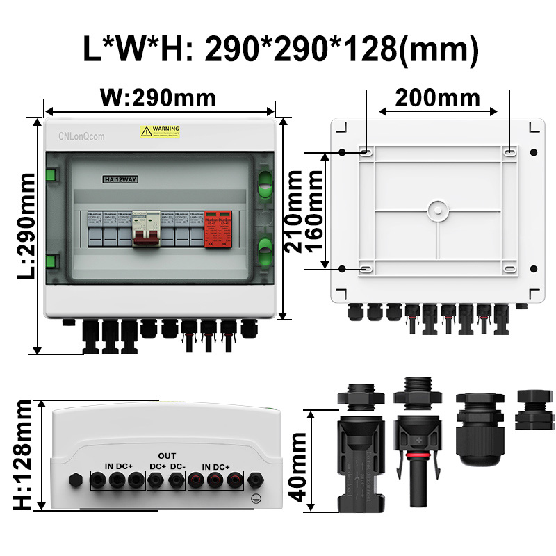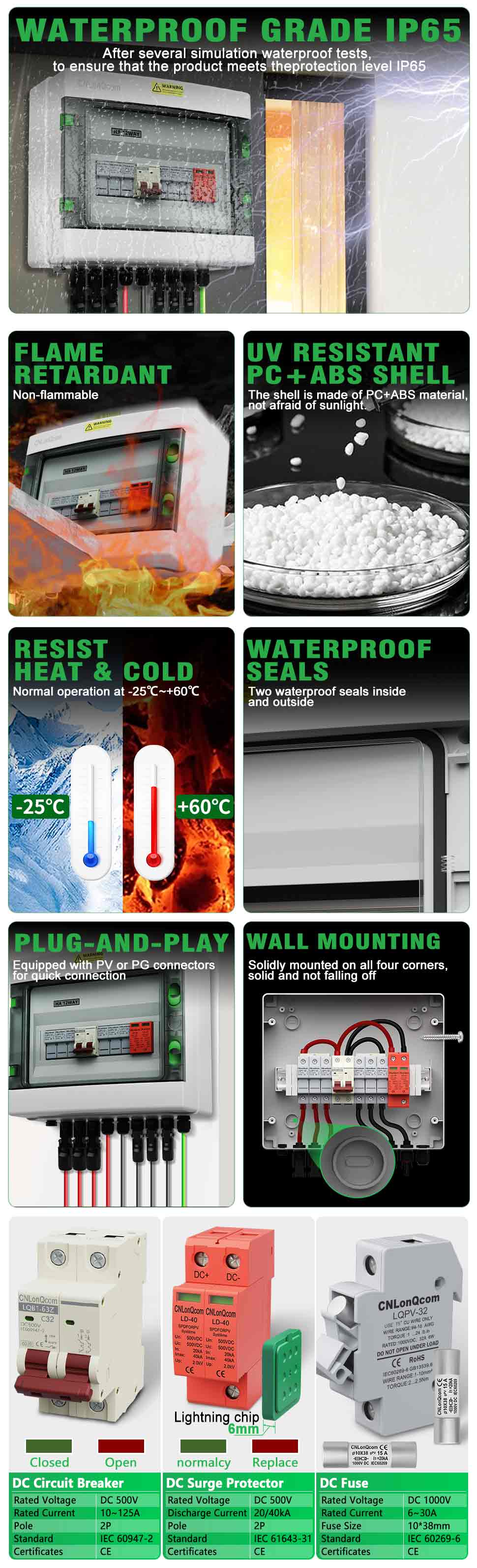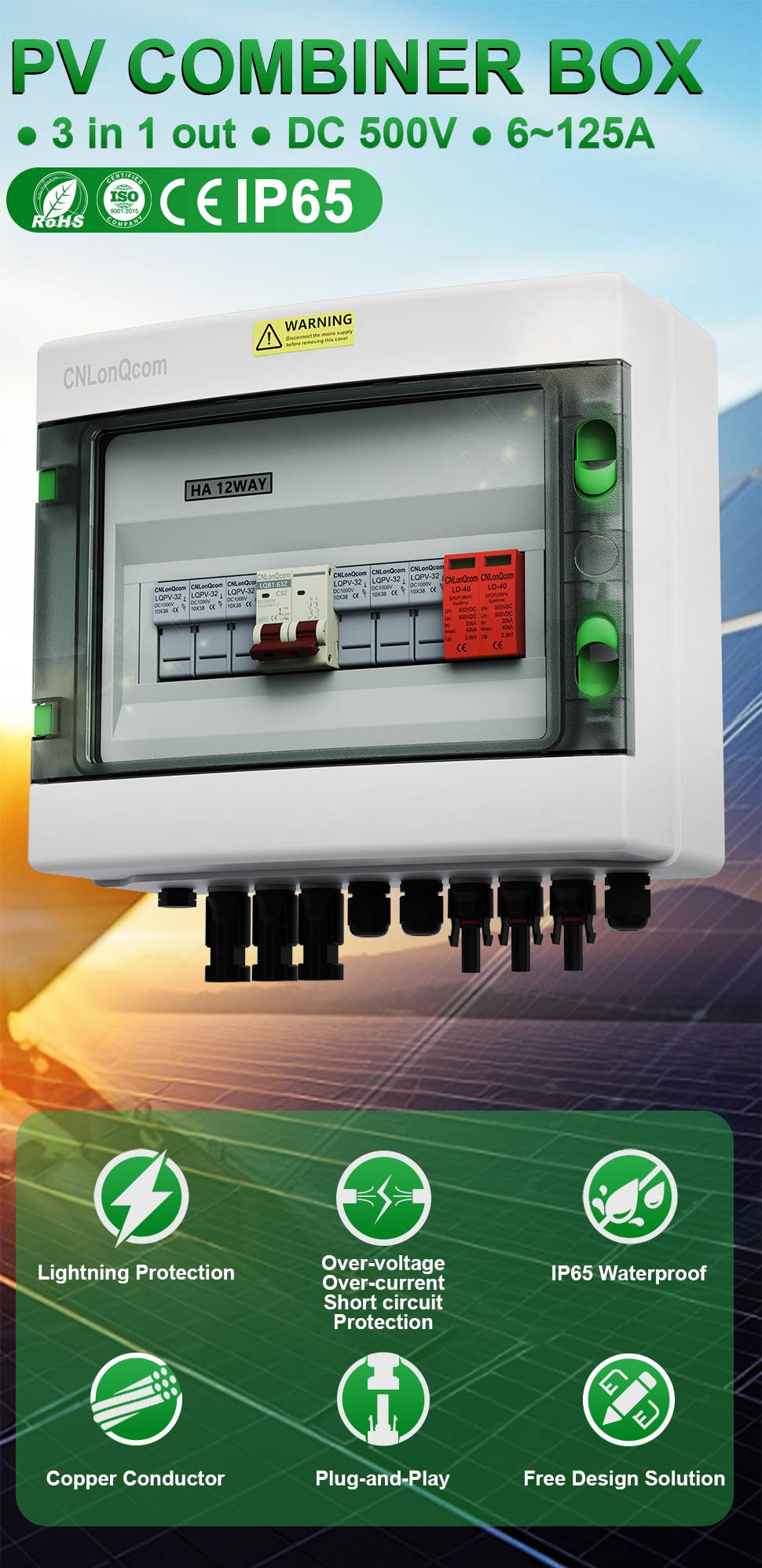 Plastové PV Combiner Combiner Combiner Cnlonqcom HA série PV 3 v 1 OUT DC500V/600V/800V sa používajú hlavne na ochranu PV systémov a často sa používajú v systémoch mimo mriežky alebo mriežky. Ako sú PV panely, RV, loď, vonkajšie PV, domácnosť atď.