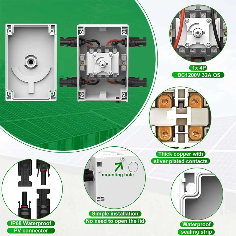 ● Navyše, náš PV solárny odpojovač DC1200V 32A 2in 2out je dodávaný s vodotesným puzdrom IP66, ktoré poskytuje výnimočnú úroveň ochrany, je vyrobené z vysoko kvalitných plastových materiálov, je odolné voči UV žiareniu a ponúka možnosti pre 2-4 póly vhodné pre rozvodné skrine. Kompaktný dizajn a vhodný na vonkajšie použitie chránia vaše odpínače pred dažďom, prachom a inými poveternostnými vplyvmi.